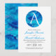 Modern and vibrant wedding invitation cards featuring a bold monogram centred in front of a round sapphire watercolor cloud circle.