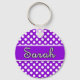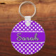 Cute keychain in small white dots pattern on purple background with Sarah name printed on it.