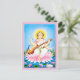 Saraswati sitting on pink lotus flower playing her instrument with her peacock sitting nearby. Very bright and colourful design that will get lots of attention. An eye-catching beauty.