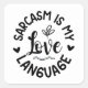 A playful and humorous circular typography design featuring the phrase, "Sarcasm Is My Love Language." The word "Love" is in a central, flowing script with small decorative hearts and a leaf motif, while the surrounding text is in a clear, bold, all-caps font. This design is perfect for those who express affection and humor through sarcasm.