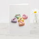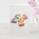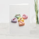 This greeting card shows five heart-shaped conversation candies scattered on a bright white background. The candies come in soft pastel colors like lavender, mint green, pale pink, light yellow, and peach, and they sit near the lower middle of the card. Each little heart has red block-style lettering stamped on it, with a slightly uneven look like real candy printing. You can read phrases like “BFF,” “MEH,” “SO,” “JUST FRIENDS,” and “CHILLIN’” right on the candy faces. The hearts look matte and slightly textured, and the gentle lighting creates small shadows that make them feel real and close-up. The simple setting keeps the focus on friendship, affection, and the funny mix of sweet and honest messages