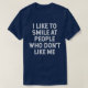 Laugh with some of the best quotations and hilarious sayings about life. Dress with attitude and a dash of wit in our exclusive "I Like to Smile at People Who Don't Like Me" T-shirt. This shirt is for the savvy individual who knows that a well-timed smile is the best response to sarcasm and negativity. An ideal Sarcastic Humour Funny Saying Hilarious Quote t-shirt for anyone who loves a funny slogan tee. Witty and Cool: Elevate your style with a touch of wit and a hint of coolness. This tee is not just an outfit; it's a statement. Humour Unleashed: Embrace the lighter side of life with this hilariously sarcastic shirt, perfect for those who appreciate a good joke. Ideal for casual outings, social events, or just expressing your unique sense of humour wherever you go.