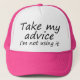 Take my advice, I'm not using it. Sarcastic one liner sure to make them smile. Black, pink and white hat.