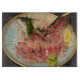 Sashimi is a Japanese delicacy. It primarily consists of very fresh raw seafood, sliced into thin pieces, and served only with a dipping sauce (soy sauce with wasabi paste or such condiments as grated fresh ginger, or ponzu), and such garnishes as shiso and shredded daikon radish.