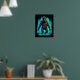 Retro Bigfoot in teal, purple and black standing by pine trees ai art for Sasquatch enthusiasts.