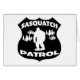 Large black police badge emblem with, “Sasquatch Patrol,” written in simple white font with a white Sasquatch silhouette in the centre and a white pine tree background.