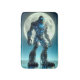 Sasquatch stands under a full moon surrounded by mountains, revealing a titanium exoskeleton of electronic circuitry and LED lights..