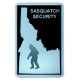 Features the dark silhouette of a Sasquatch (Bigfoot) on a powder blue background enclosed by the outline of Idaho along with text reading, "SASQUATCH SECURITY."