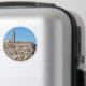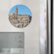 Round photo magnet with the ancient architecture of the Sassi di Matera with houses cut into the mountain like caves on a clear day with a blue sky in the Basilicata region in southern Italy.