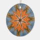 This artwork features a prominent six-pointed star at its core, layered with varying shades of orange and a distinctive dark brown animal print. Radiating from this central star are six elongated, stylised shapes in olive green and yellow with intricate markings, resembling feathers or stylised leaves. The light blue background subtly enhances the central motif with radiating lines.