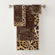 These cream beige towels feature a captivating patchwork design inspired by African wildlife. The bordered cheetah motifs intertwine with geometric patterns in a rich Hershey brown, celebrating the natural beauty of the continent.