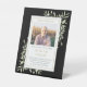 An elegant black and gold father-of-the-groom wedding memorial pedestal sign featuring a special photo, watercolor greenery and your own personalised poem. Reserve a seat at your ceremony at the table he would have sat at. Designed by Thisisnotme©
