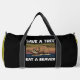 This witty black duffle bag features a beaver chewing on a tree stump with a retro sunset in the background, accompanied by the humourous and provocative phrase "SAVE A TREE EAT A BEAVER." It’s a bold statement piece for those with a unique sense of humour and appreciation for wordplay. Perfect for gym, travel, or just to spark a conversation. Edit colour of the bag caps and body in the Design tool to your favored colours.