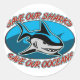 Menacing looking shark grabs your attention in this Save our Sharks, Save our Oceans design! Shark with water oval background and rad and blue text! Great message and perfect for shark and ocean lovers!