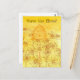 A postcard to send a "save the bees" message decorated with honeybees flying around a vintage bee skep in a field of wildflowers illustrated with sepia ink on a warm honey yellow watercolor wash background. Great for postcard exchanges!