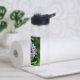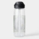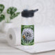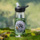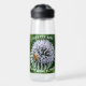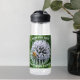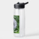 Clear plastic water bottle to take while on the go that features the photo image of a fuzzy bee on a Globe Thistle flower, along with text printed in white letters that reads, "Save the Bees/Plant More Flowers." A lovely, floral design that expresses a message for the environment to save the bees and plant more flowers. Select your drinking water style.