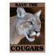 A close up of a cougar with the words Save The Cougars surrounding it.