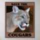 A close up of a cougar with the words Save The Cougars surrounding it.