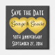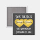 This magnet features a pair of gold hearts with white-washed centres overlaid by a text template for the names of the bride and groom. The words "Save the date" appear above the hearts and text templates appear below the hearts. The design can be customised for an engagement party, bridal shower, rehearsal dinner, wedding, anniversary or valentine's party favour or save-the-date.