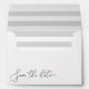 Elegant white envelopes for your 5x7 save the date cards feature your return address pre-printed on the back flap, along with a subtle grey and white striped lining and "save the date" along the bottom in chic hand lettered script typography.