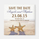 Cute starfish couple in the sand beach wedding save the date magnets, the photos is taken with professional photo camera in a bright sunny day in the beach.