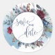Beautiful Save the Date envelope seal, with modern hand written calligraphy "Save the Date" phrase encased by gorgeous watercolor floral bouquet with flowers and foliage in dusty blue, navy, burgundy, purple and magenta hues with exquisite blue watercolor stain cascading behind. Part of our "Celestial Blooms"" collection with variety of coordinating products available.
