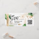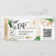 Destination Beach Wedding Boarding Pass Ticket Gold Plane Save the Date with Cruise Ship icon with tropical leaves. Add your QR Code