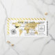 Boarding pass wedding save the date ticket invitation featuring a elegant gold foil destination world map, compass, aeroplane, and a personalised text template.