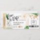 Destination Beach Wedding Boarding Pass Ticket Gold Plane Save the Date with Cruise Ship icon with tropical leaves
