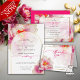 Send out your Save the Date requests- Modern text and calligraphy fits nicely inside this beautiful sheer white gold edged arch frame that shows the underlying fantasy bright fuchsia scarlet peony flowers also edged in gold - original artwork © by WhimsicalArtwork™.