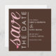 This adorable Save The Date announcement features the phrase "save the date" in pink and white on the left of the announcement, and your personalisation on the right in white.