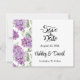 Save the Date Card is shown in a classic formal layout in the colour white with Black text and script text highlighting the Bride and Groom names and accented with a lovely lilac flowers print.