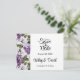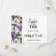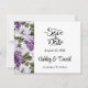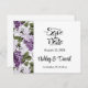 Save the Date Card is shown in a classic formal layout in the colour white with Black text and script text highlighting the Bride and Groom names and accented with a lovely lilac flowers print.