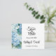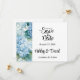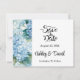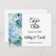 Save the Date Card is shown in a classic formal layout in the colour white with Black text and script text highlighting the Bride and Groom names and accented with a hydrangea flowers print.