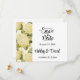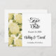 Save the Date Card is shown in a classic formal layout in the colour white with Black text and script text highlighting the Bride and Groom names and accented with a lovely light-yellow hydrangea flowers print.