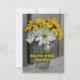 A wedding save the date featuring a photo of a jar of daisies and black eyed susans over a background of barnwood. Look for matching wedding invitations and more at Jill's Paperie.