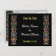 A custom Save the Date postcard with beautiful gothic illuminated manuscript art of flowers and scrolling leaves on a black background, and editable text in blackletter fonts.