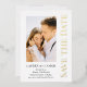 Save The Date Elegant Modern Wedding Gold Foil Invitation Cards features a white background with your custom photo. "Save The Date" is stamped in gold foil adding luxury and style to your wedding save the date cards. Personalise with your text by editing the text in the text boxes provided. Designed for you by ©Evco Studio www.zazzle.com/store/evcostudio