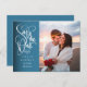 This elegant white script photo save the date card features your special photo and a decorative script save the date above your names, date and venue. The reverse has additional save the date details, including your wedding website. You can customise the background to your favourite colour. Designed by Thisisnotme©