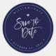 Save the date sticker with fun and modern handwritten script font in faux silver and DIY navy blue background.