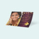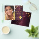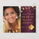 On front: Add your own vertical size photo of the graduate. A burgundy background colour, decorated with faux gold stars. Personalise and add a name and date. Golden letters. The name and the text: Save the Date are written with a modern hand lettered style script.
