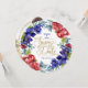 Watercolor floral arrangement of deep blue/purple flowers complimented with red flowers. Save the Date in a whimsical gold script with hand drawn hearts. Date, names and other info are customisable. Option of photo on backside.