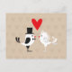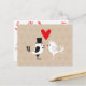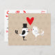 This charming wedding postcard features bride and groom Lovebirds throwing red heart kisses highlighted against a tan heart background. The back of the postcard can be fully personalised with names of the bride and groom, wedding date, and location.