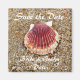 Rust-coloured scallop shell resting on a sandy beach. Unique save-the-date design for your wedding or other event.