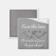Save the date magnet | Drawn hearts in beach sand. Romantic black and white photo near the sea. Personalizable with wedding date and name of bride & groom. Romance / marriage theme design. Entwined hearts drawing with elegant script text.