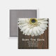 A wedding save the date magnet featuring an image of a white gerbera daisy peeking from top over a background of barnwood. Personalise the text. Look for matching wedding invitations, rsvp cards, and more at Jill's Paperie.