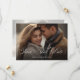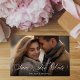 This design features a simple save-the-date card, with a modern minimalist style, for weddings, with a black and white, elegant, classy, photo template, with a QR code on the back, calligraphy script, and elegant typography