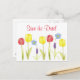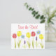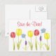 A colourful "save the date" postcard decorated with spring flowers with yellow and red tulips, blue flowering flax and grape hyacinths. Cheerful postcard!