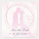 A beautiful romantic wedding design set of square stickers showing the framed kissing silhouettes of the bride and groom against a dreamy pink background, with customisable date and words "Save the Date" at the bottom.