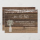 Rustic Farmhouse String Lights and Baby's Breath in a Jar Save the Date Wedding Invitations on Wood background - includes beautiful and elegant script typography with modern Country Farm House Sparkle for the special Wedding day celebration.